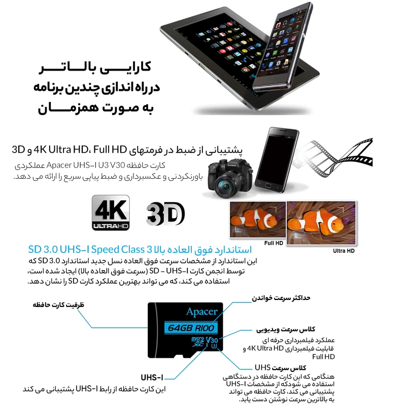 کارت حافظه microSDXC اپیسر مدل V30 کلاس 10 استاندارد UHS-I U3 سرعت 100MBps ظرفیت64گیگابایت به همراه آداپتور SD